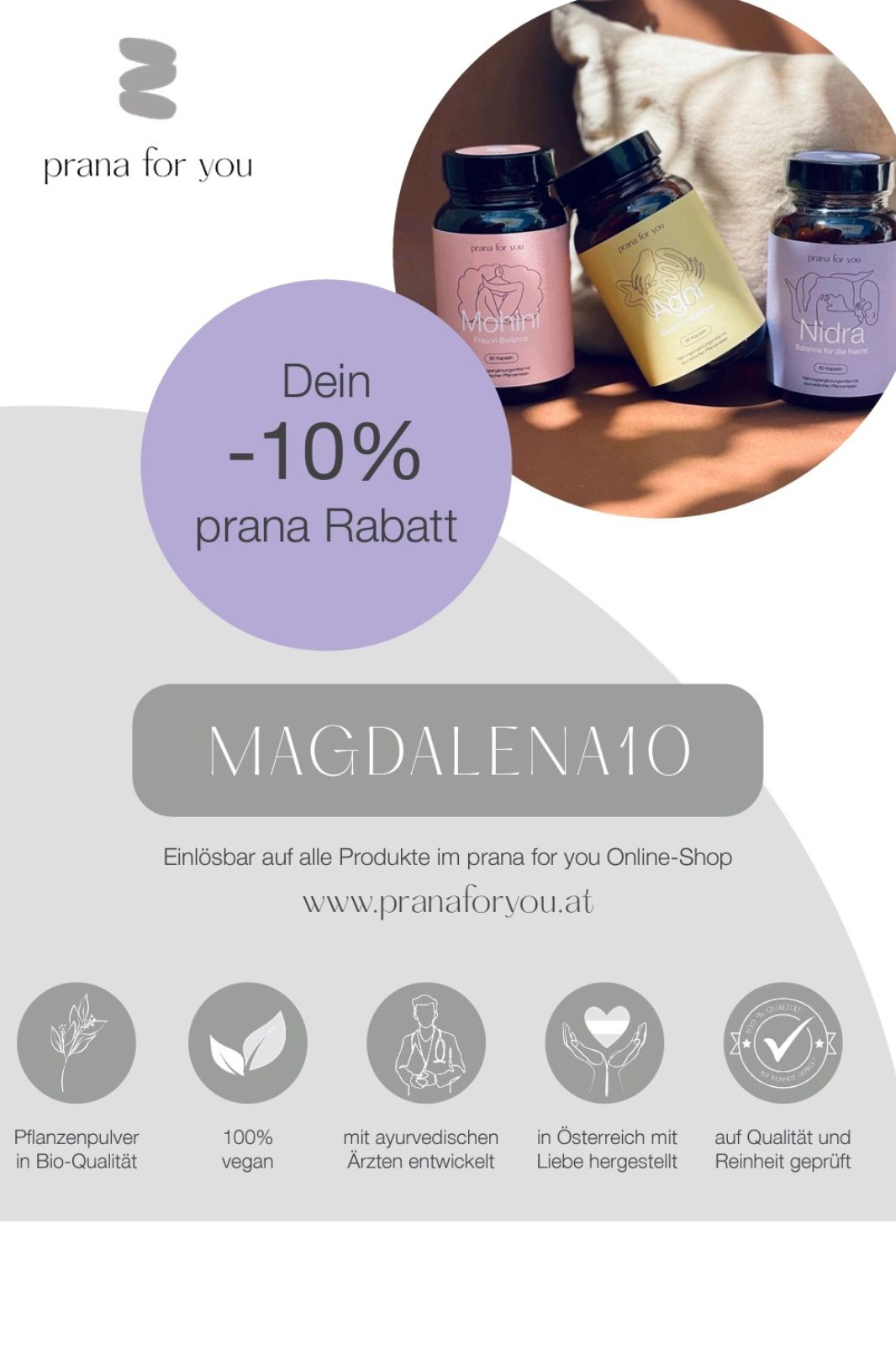 Mit dem Rabattcode MAGDALENA10 erhälst du 10% Rabatt auf alle Produkte im prana for you Online-Shop.
